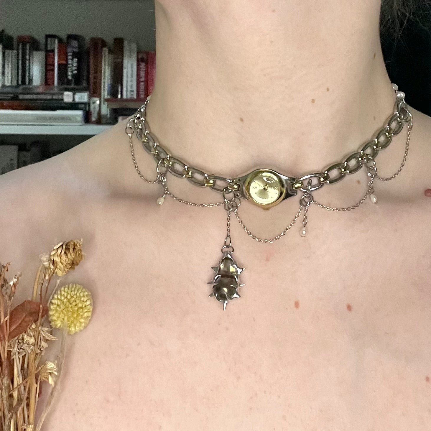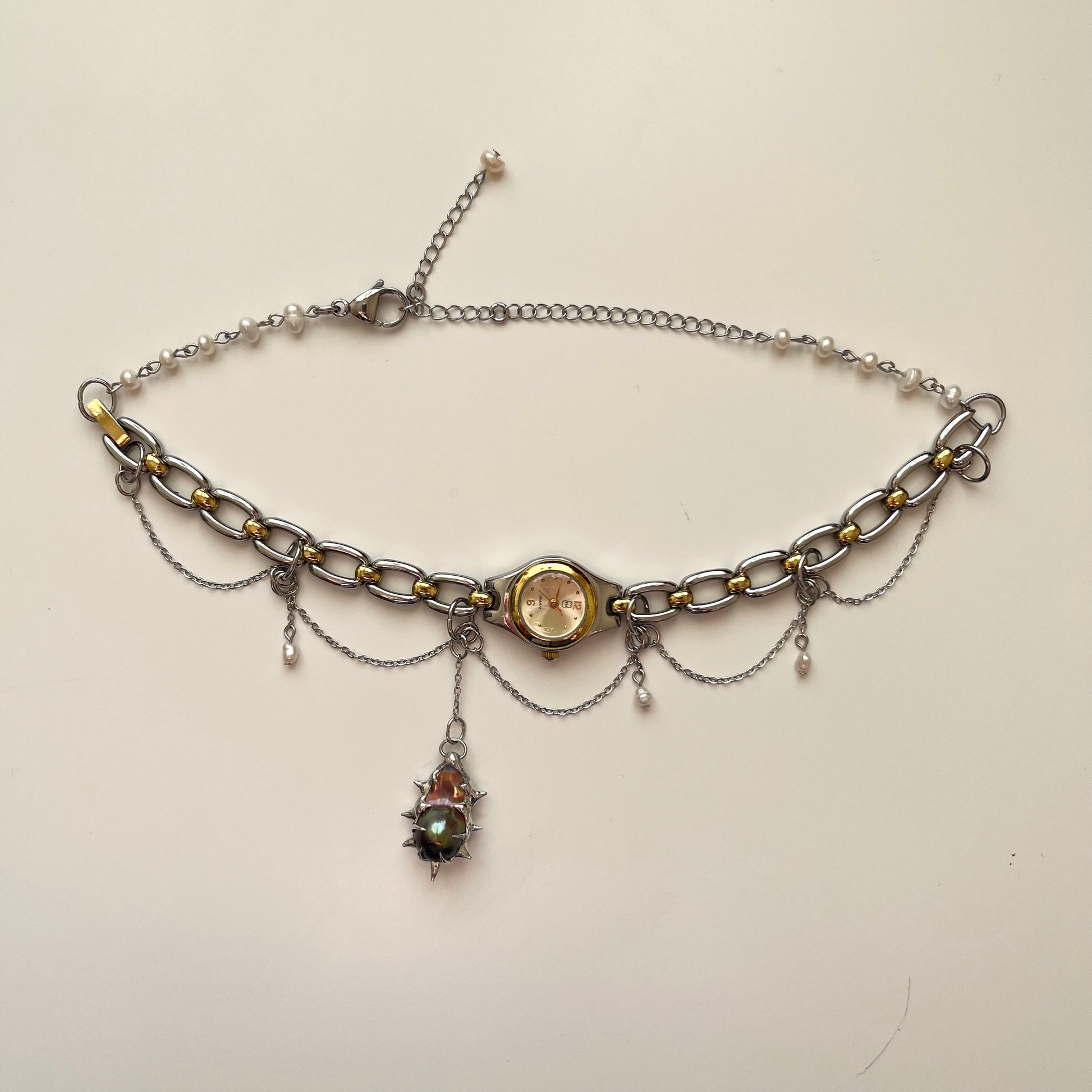 One of a kind upcycled watch necklace with a hand soldered freshwater pearl pendant.
