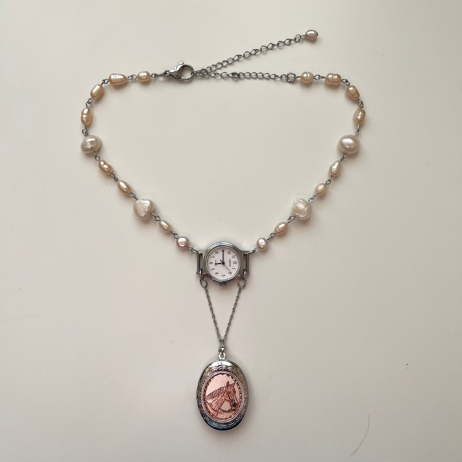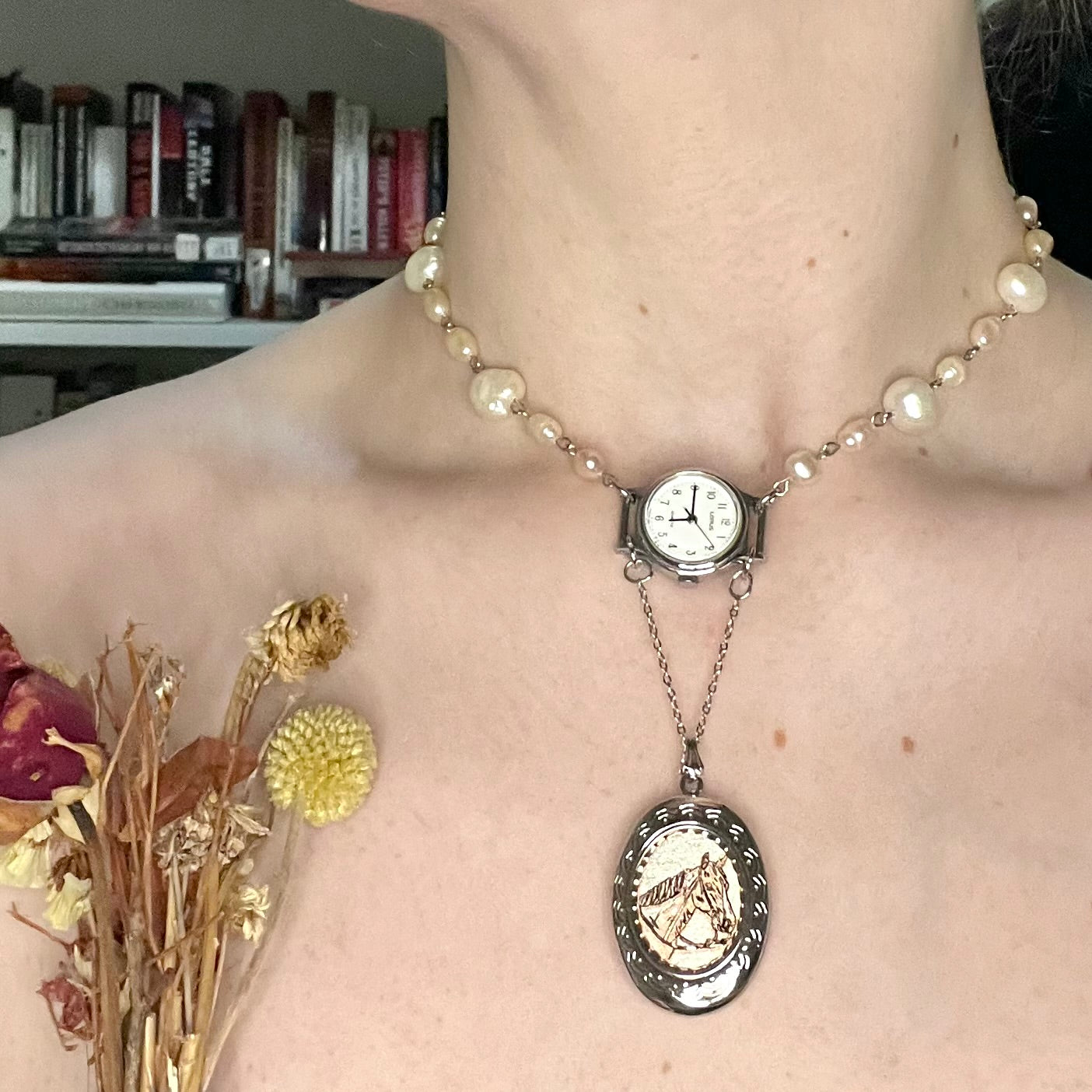 One of a kind upcycled watch necklace with an horse locket pendant.