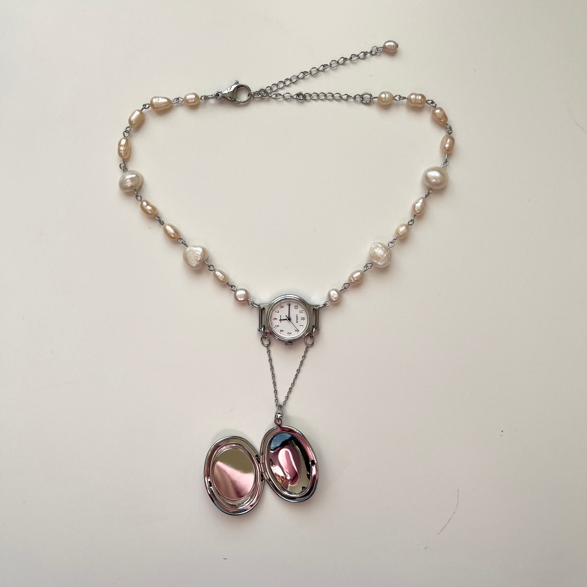 Watch, mother of pearl and freshwater pearls are sourced from charity shops and car boot fares.