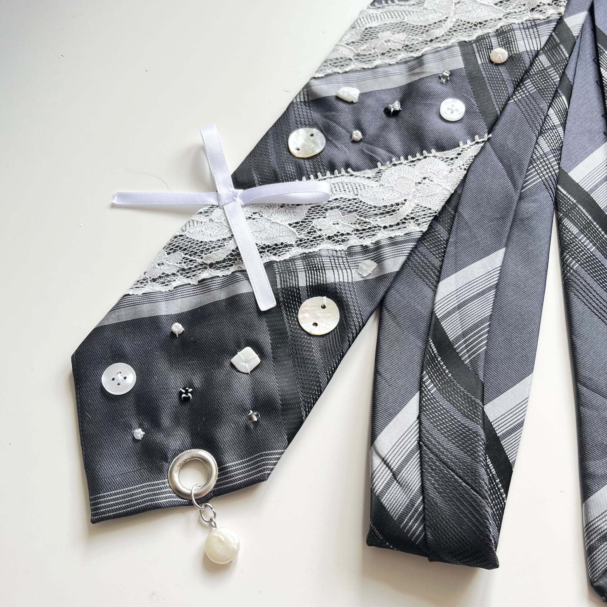 One of a kind upcycled tie embellished with vintage lace, upcycled beads and second-hand pendants.