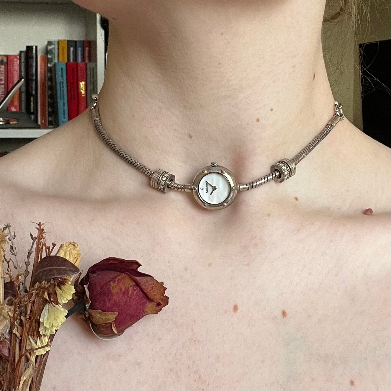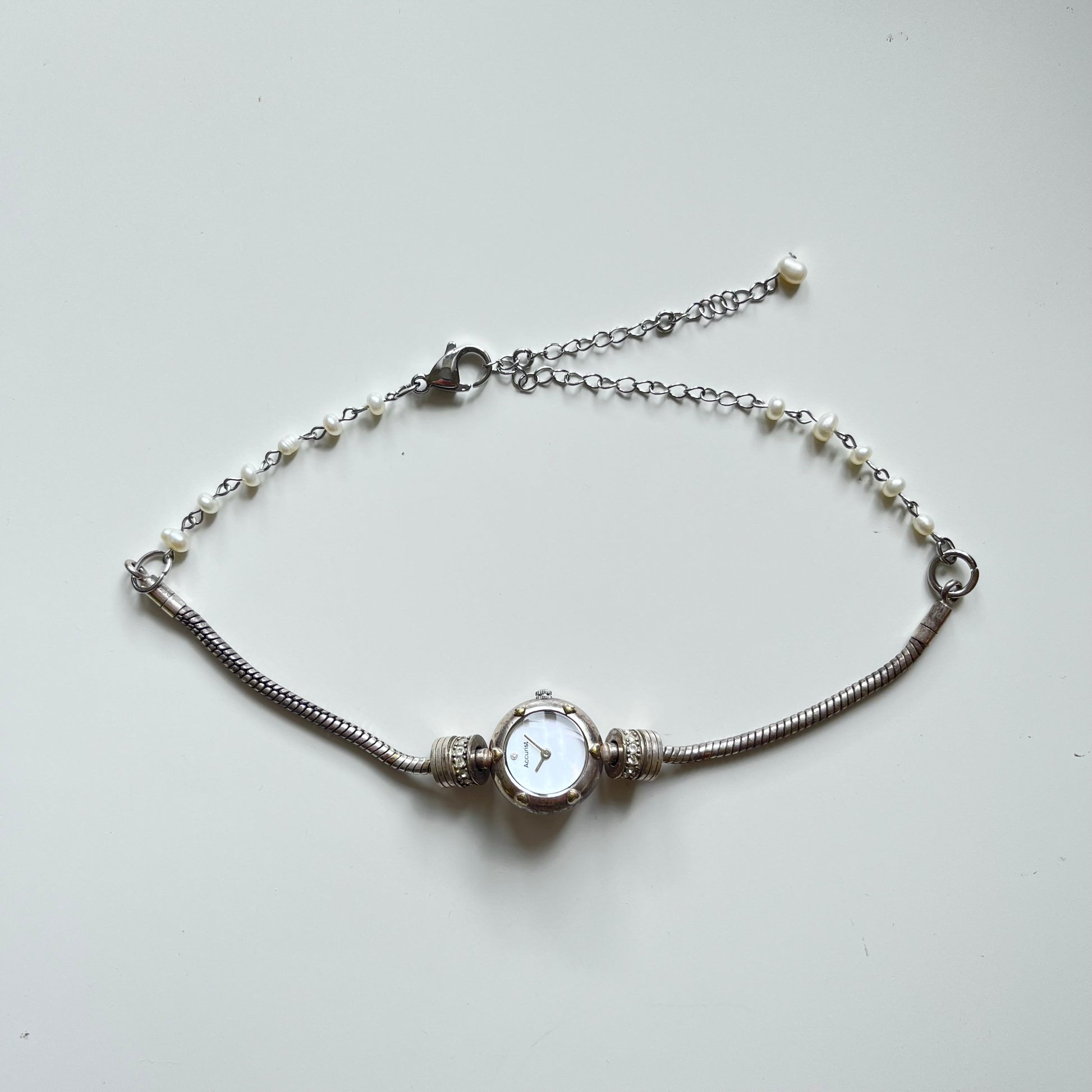 Watch, and freshwater pearls are sourced from charity shops and car boot fares.