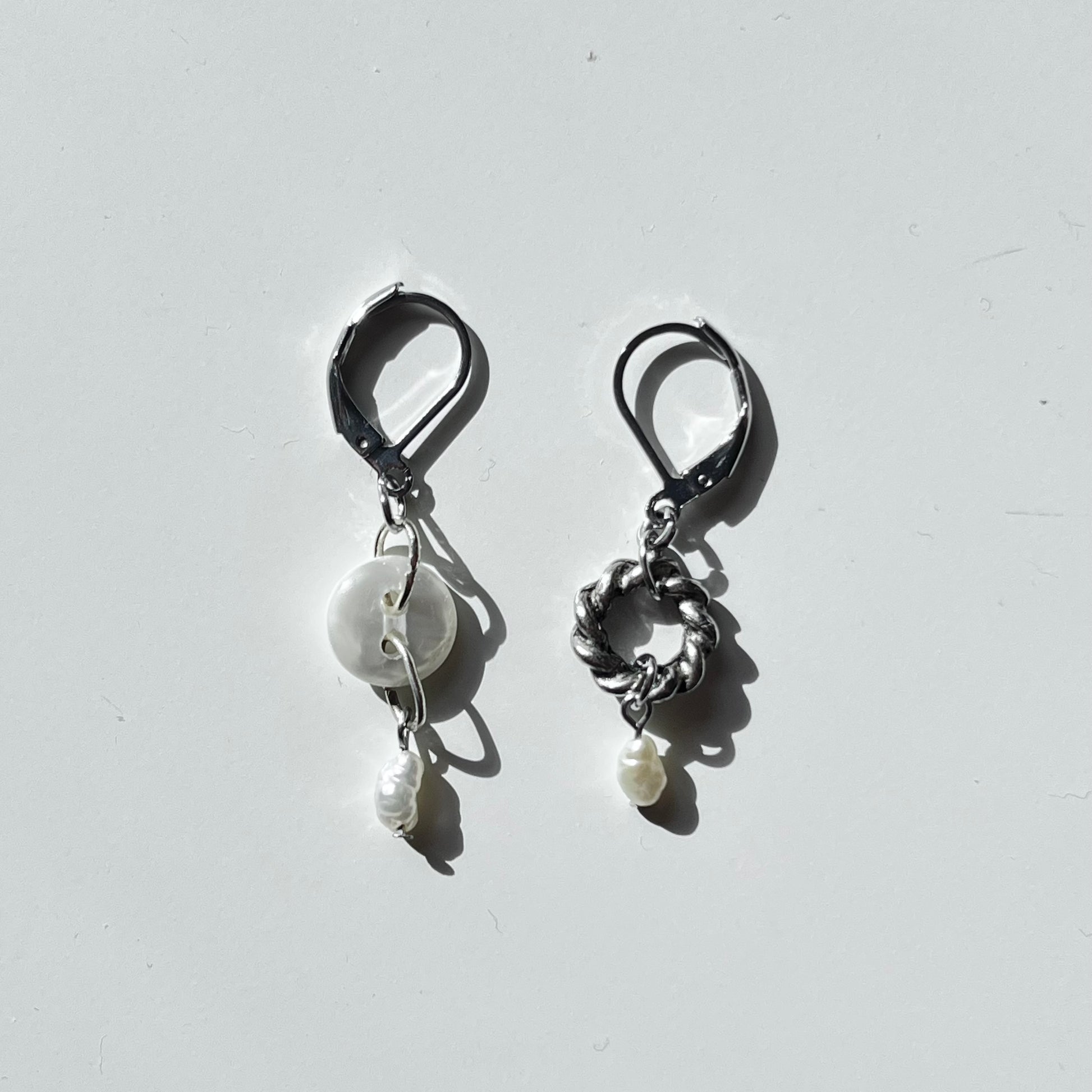 Upcycled earrings with freshwater pearls.