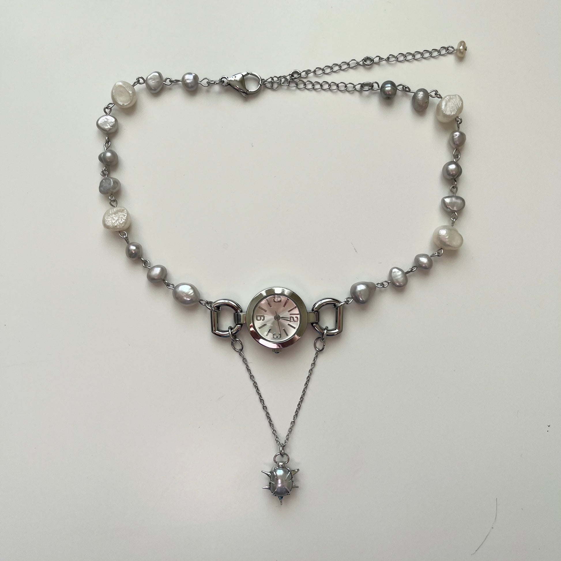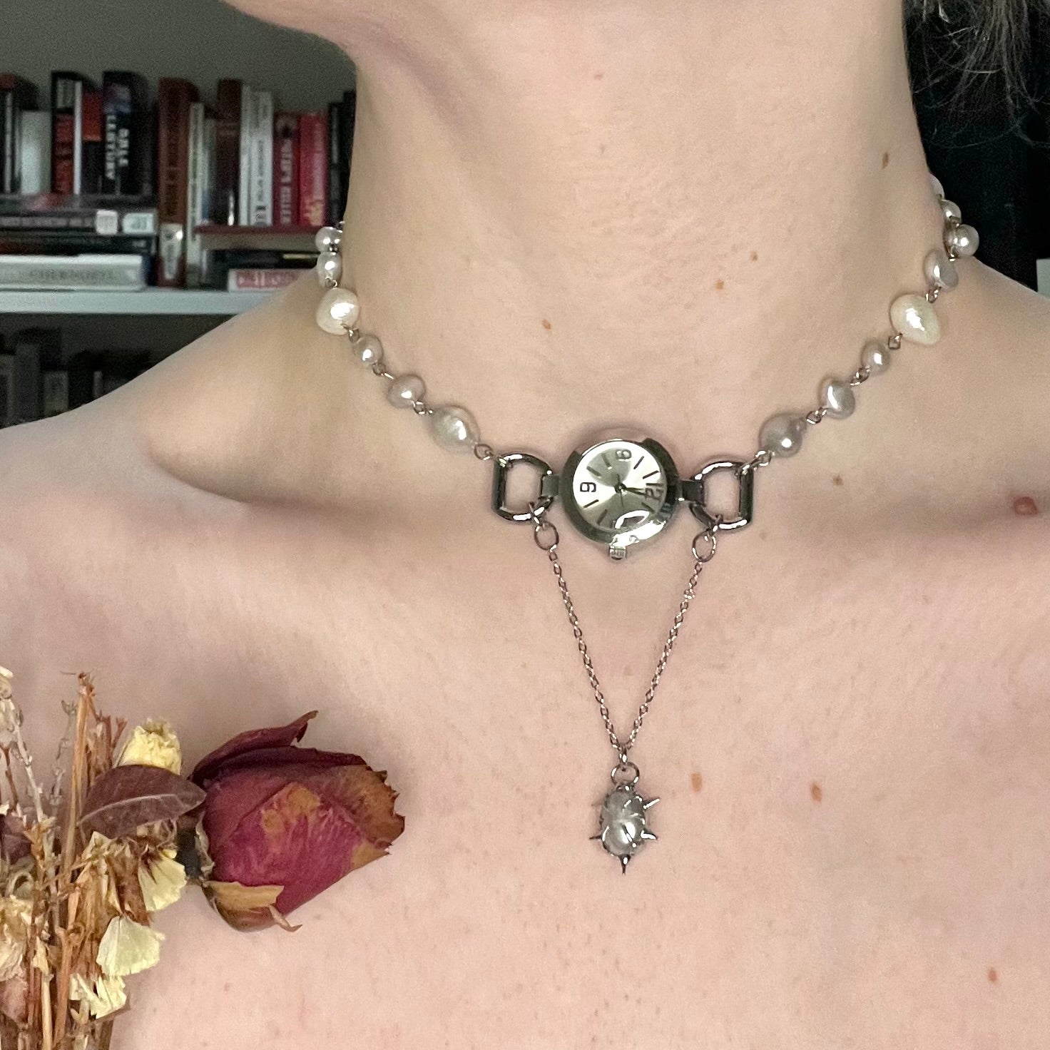 One of a kind upcycled watch necklace with a hand soldered freshwater pearl pendant.
